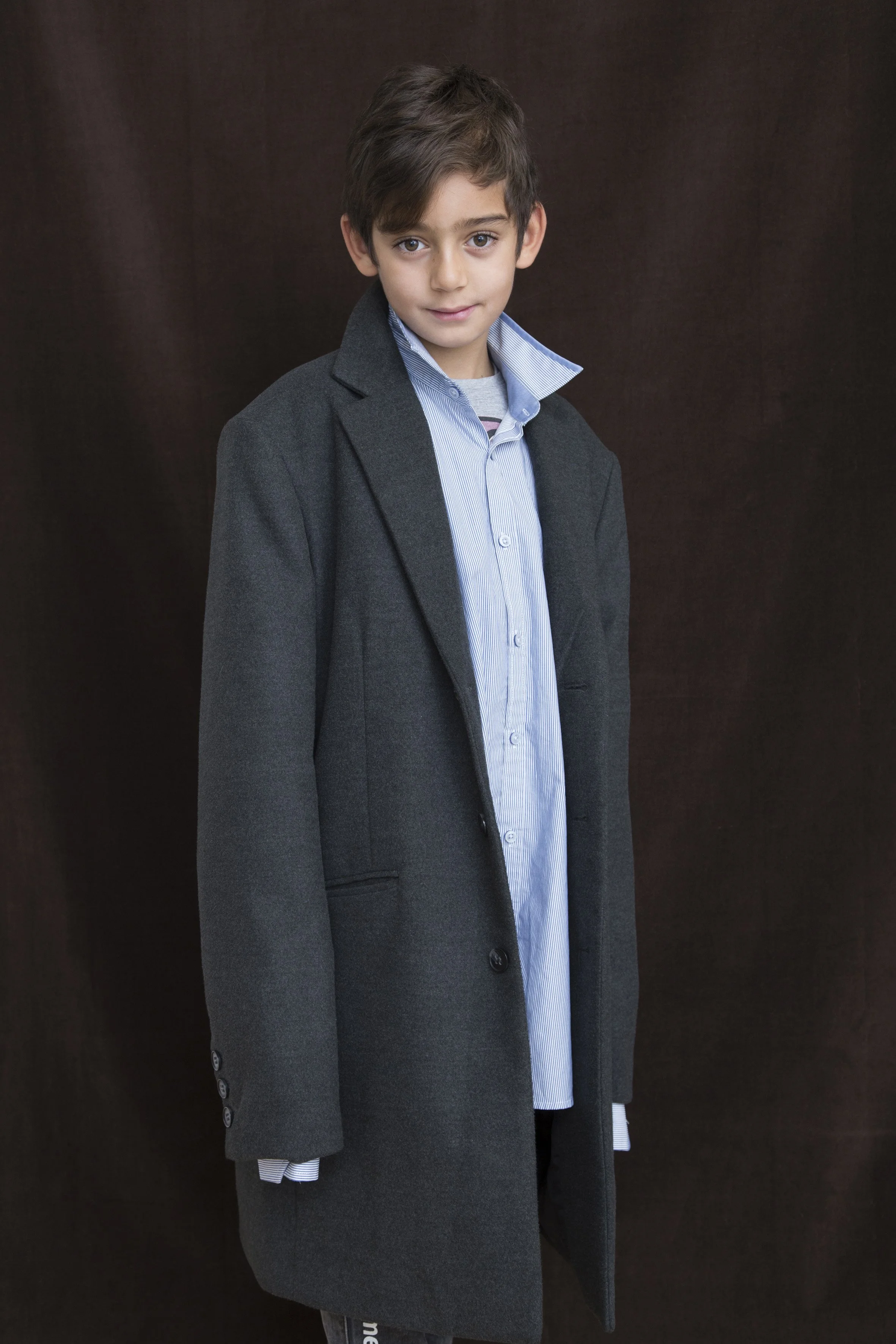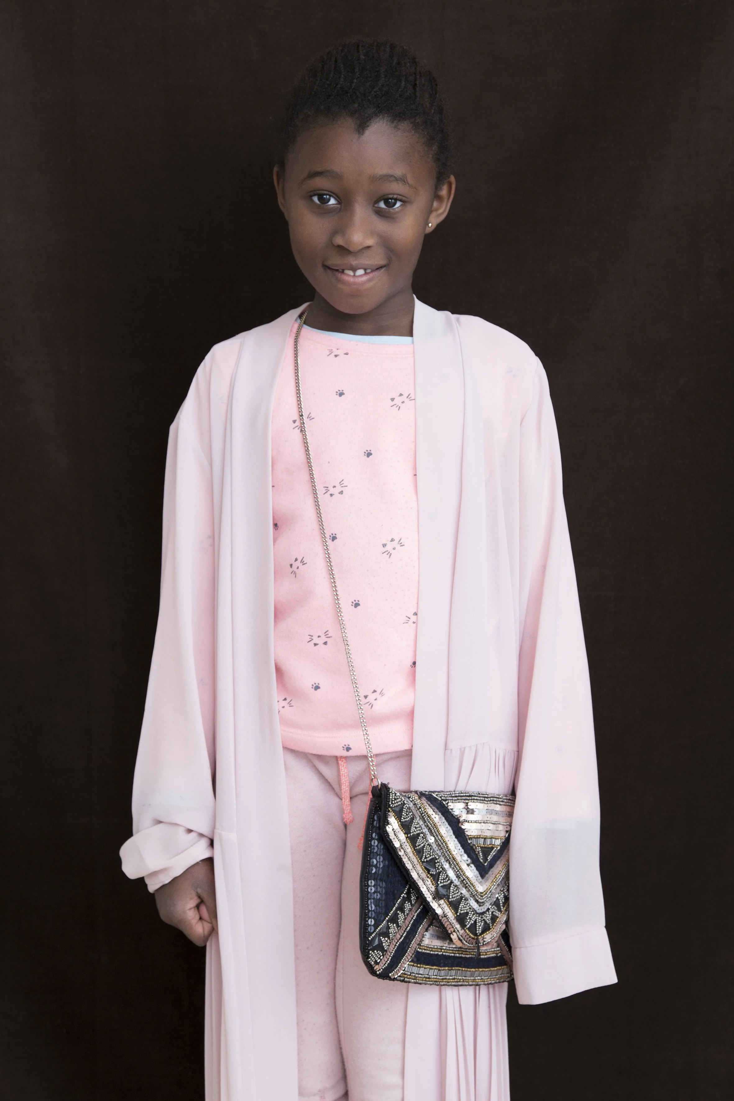 L’idée de cette série m’est venue d’expériences de mon enfance, lorsque j’ouvrais le placard de mes parents pour essayer leurs vêtements. Puis, plus récemment, en observant les enfants dans la rue, dans les photographies de mode, ou encore dans les concours de beauté, j’ai trouvé un intérêt à réaliser une série de portraits où les enfants seraient habillés avec un vêtement appartenant à un de leurs parents.